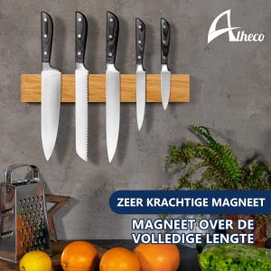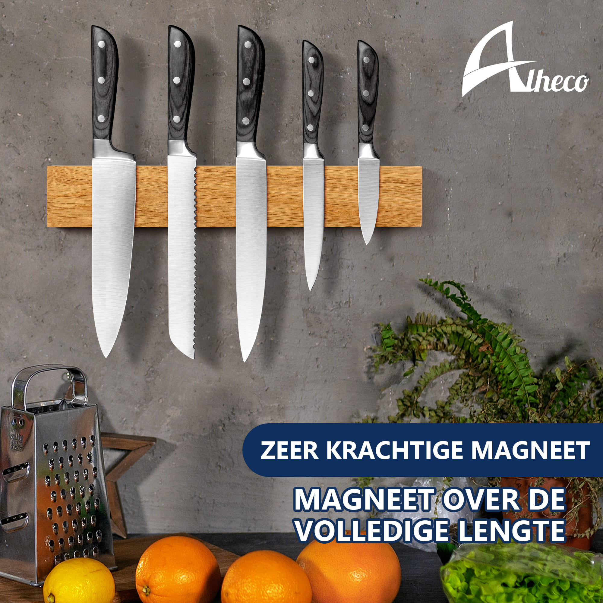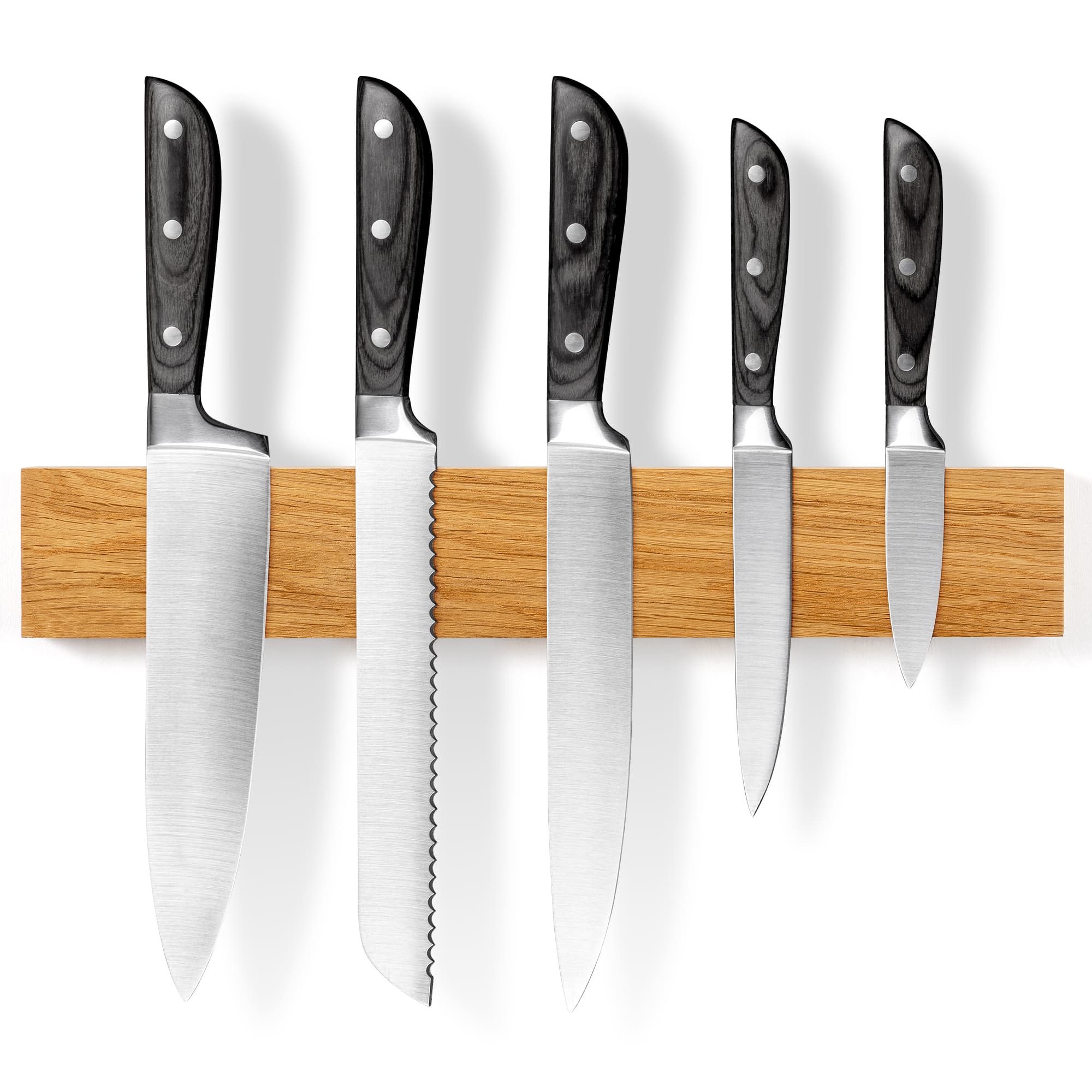 Houd messen veilig en overzichtelijk met de magneetstrip voor messen eikenhout. Duurzaam eikenhout, sterke magnetische grip en eenvoudig schoon te maken voor een nette keuken.