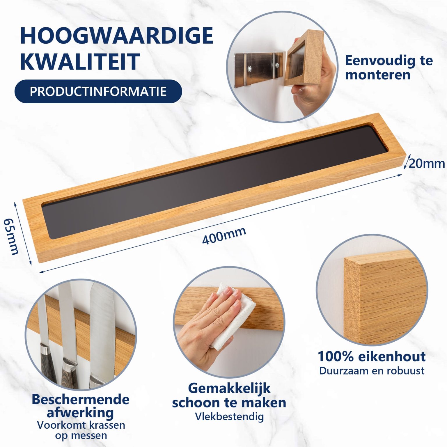 De magneetstrip voor messen eikenhout is gemaakt van hoogwaardig eikenhout en stevige ferrietmagneet. De houten afwerking beschermt je messen tegen krassen en behoudt hun scherpte. Bovendien is deze magneetstrip hygiënischer dan een traditioneel messenblok: hij is eenvoudig schoon te maken en houdt geen stof of kruimels vast. Het gebruik van natuurlijke materialen maakt de strip ook duurzaam en langdurig mooi.